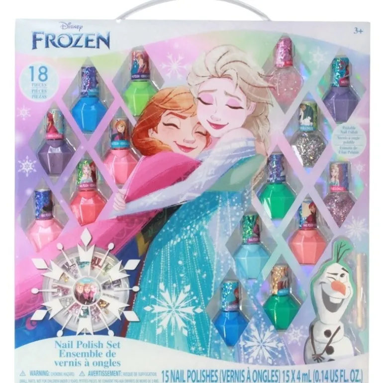 Setet innehåller 15 nyanser av giftfria och avdragbara nagellack och nagelstenar, vilket ger alla möjligheter att skapa det perfekta Frozen II-glamlooket – både på händer och fötter! Lacken finns i både glittriga och opaka nyanser, så hon kan blanda och matcha för att skapa oändliga variationer. Hon kommer att ha den bästa manikyren i hela Arendelle!
