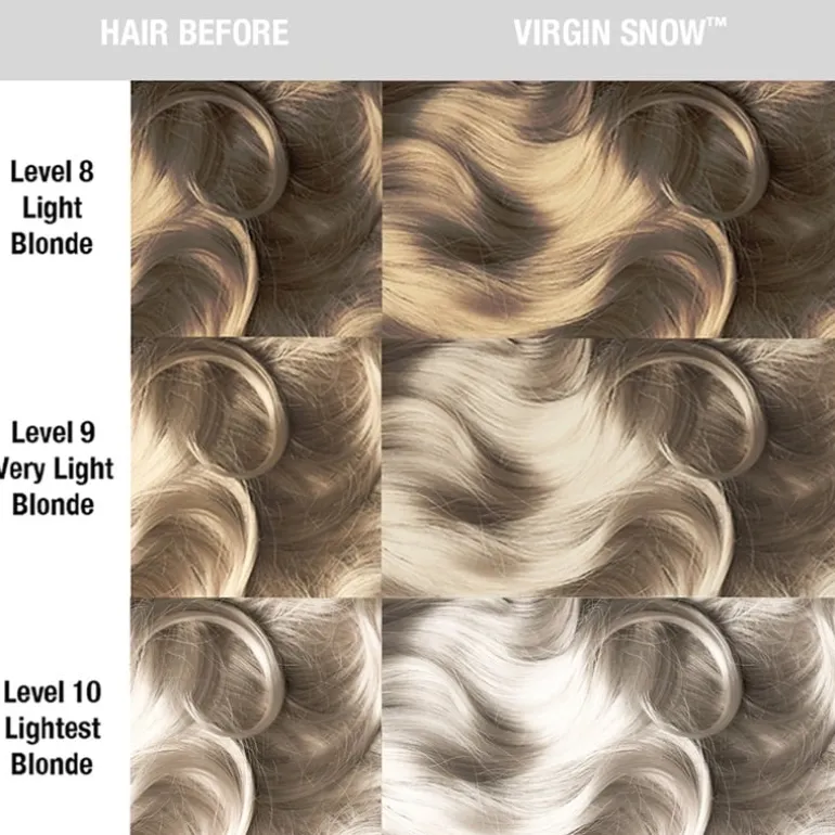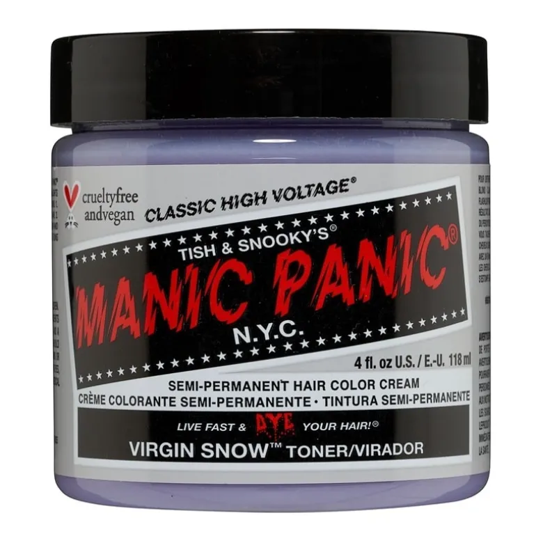 Virgin Snow är en blå-tonad toner som är framtagen för att ta bort varma toner på den ljusaste nivå 10 blond. Som alla nyanser från Manic Panic så är Virgin Snow dubbelverkande som djup balsam samtidigt som den färgar håret. Pastell och gråa toner innehåller mindre pigment än starka färger och kommer bleka håret snabbare.