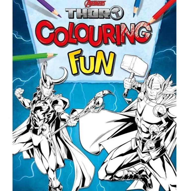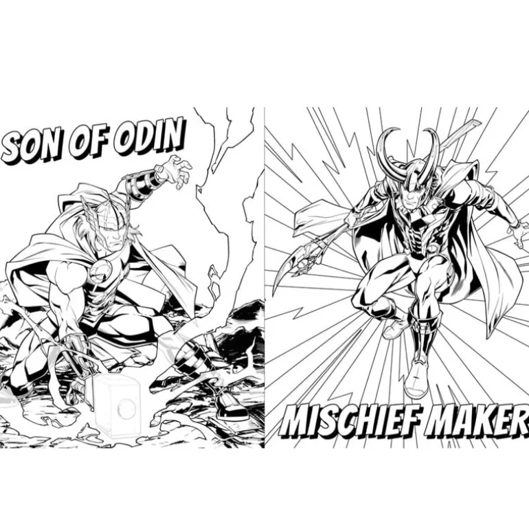 Med 24 sidor fyllda med roliga färgläggningar kan du följa med Odens son och Avengers när de skyddar jorden från en rad hotande superhjältar och skurkar!