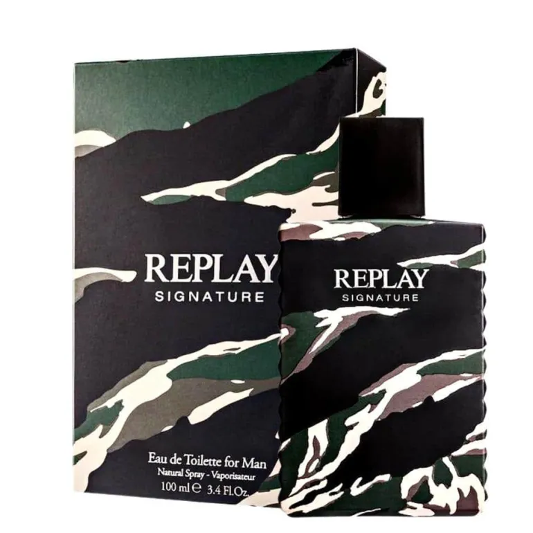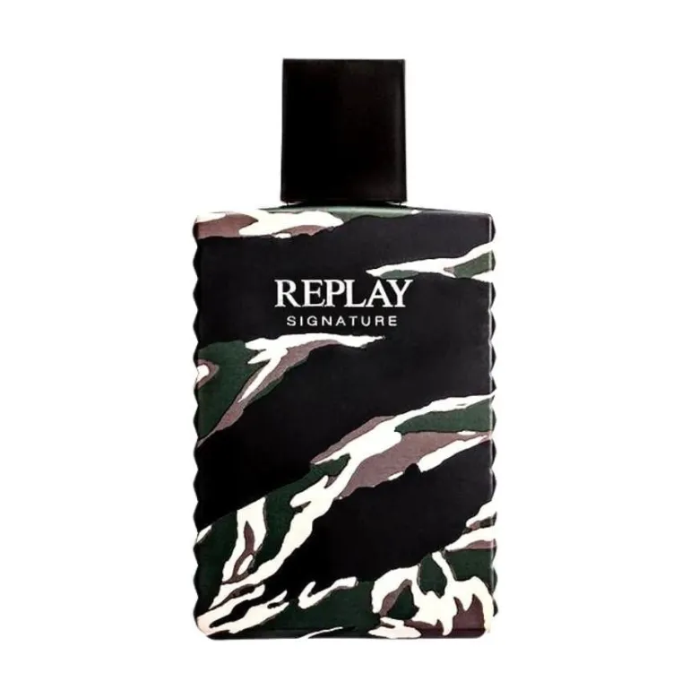 Med sin innovativa design strävar Replay Signature efter att överföra andan från Replay modekollektion till parfymvärlden. Den institutionella formen på flaskan förstärks av reliefer på båda sidorna. Kamouflagemotivet pryder hela flaskan och gör den mycket iögonfallande. Doften är den nya pulserande sensualiteten för män. Den förför omedelbart med sin karakteristiska första not av rosépeppar, bekräftad av frisk bergamott och varm kanel. Aromatiskt mintigt geranium och stark muskotnöt utvecklar en kraftfull maskulin kryddig blandning, harmoniserad av balsamisk ros och torrt cederträ. Basen är gjord av ädla träslag, vilket ger styrka och värme till doften tillsammans med delikata toner av amber-mysk.