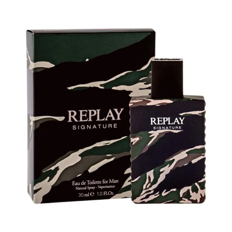 Med sin innovativa design strävar Replay Signature efter att överföra andan från Replay modekollektion till parfymvärlden. Den institutionella formen på flaskan förstärks av reliefer på båda sidorna. Kamouflagemotivet pryder hela flaskan och gör den mycket iögonfallande. Doften är den nya pulserande sensualiteten för män. Den förför omedelbart med sin karakteristiska första not av rosépeppar, bekräftad av frisk bergamott och varm kanel. Aromatiskt mintigt geranium och stark muskotnöt utvecklar en kraftfull maskulin kryddig blandning, harmoniserad av balsamisk ros och torrt cederträ. Basen är gjord av ädla träslag, vilket ger styrka och värme till doften tillsammans med delikata toner av amber-mysk.