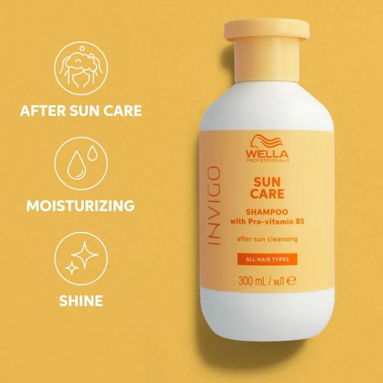 Wella Professionals Invigo Sun After Sun Cleansing Shampoo är ett skonsamt rengörande schampo för sol-, sand- och havsexponering. Detta schampo innehåller Sun-blend och provitamin B5 som skonsamt rengör håret utan att ta bort de naturliga oljorna från hår och hårbotten. After Sun Cleansing Shampoo återfuktar på djupet och hjälper till att minimera risken för att håret torkar ut eller får kluvna toppar. Avsluta med Wella Professionals Invigo Sun Express Conditioner för bästa resultat. Din after sun-rutin för alla hårtyper.