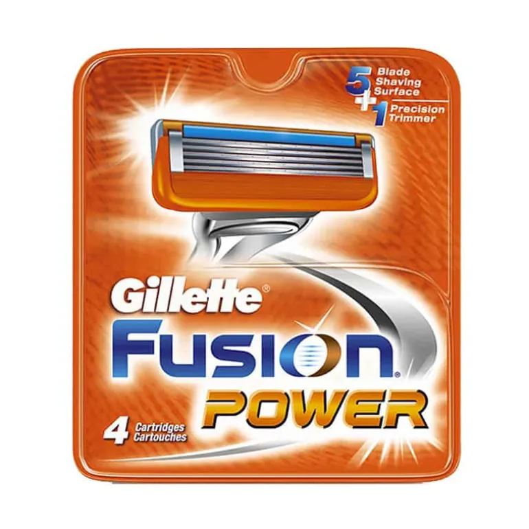 Rakblad till Gillette Fusion Power rakhyveln i 4-pack. Nya Fusion Power från Gillette har fem tätt sittande rakblad för en bättre rakning. De fem bladen fördelar trycket mellan bladen vilket minskar trycket mot huden och ger mycket bättre komfort. Fusionrakbladen har även en precisionstrimmer som består av ett rakblad på baksidan av hyveln. Den är perfekt till svåråtkommliga områden och gör det enkelt att trimma polisonger, skägg och ansiktshår.